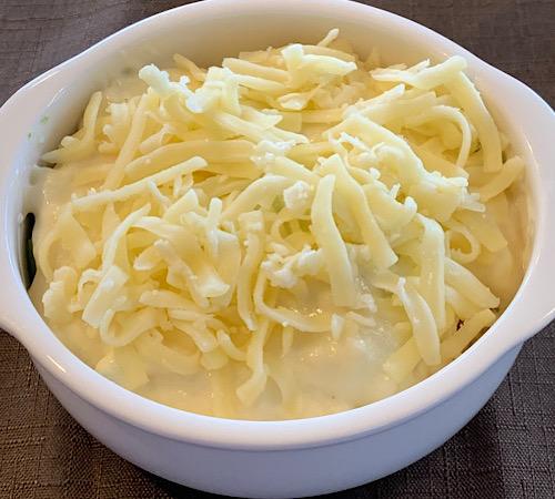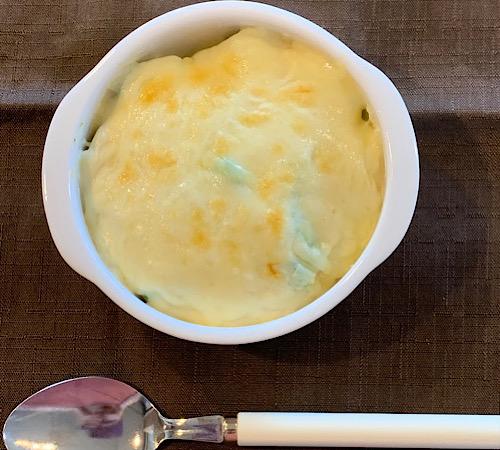 ホワイトソースを流し入れて、ピザ用チーズを散らす。オーブントースターで3分程度焼いたら完成となる。