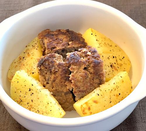 耐熱皿に、ハンバーグとじゃがいもを並べる。