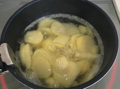 じゃがいもの皮をむき、1cm幅の輪切りにする。鍋に湯をわかし、輪切りにしたじゃがいもを入れ、潰しやすくなるまで柔らかく茹でる。もみ海苔は乾いた包丁とまな板で細かくみじん切りにする。