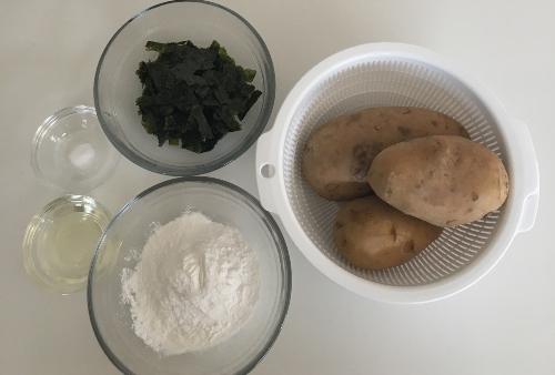 じゃがいもが茹であがったらボウルにうつし、水を加えながらマッシャーやフォークを使って潰す。米粉、塩を加えてさらに混ぜ、もみ海苔も入れる。もみ海苔は、2~3回に分けて振るい入れるとまんべんなく混ざるだろう。