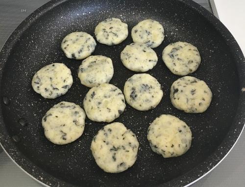 フライパンに大さじ1のサラダ油を入れ、中火にかける。油が温まったら形作ったじゃがいもを並べ、表面がきつね色になるまで約3分焼く。裏返したら残りのサラダ油を入れ、更に3分焼けば完成だ。