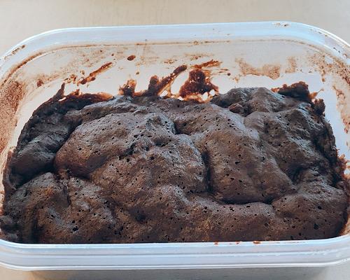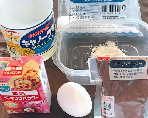 中位のサイズのタッパーに、ココアパウダー、小麦粉、ベーキングパウダー、グラニュー糖を入れて、フタをしてよく振っておく。