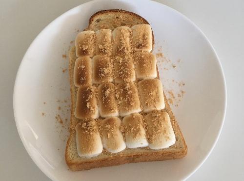 マシュマロを食パンの上に並べる。マシュマロは加熱により膨らむので、少し隙間を作りながら並べる。