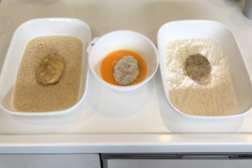 小判型に成形し、小麦粉、溶き卵、パン粉の順で衣を付ける。箸などを使うと形が崩れやすいので、ビニール手袋を使って手で優しく衣付けするのがおすすめだ。