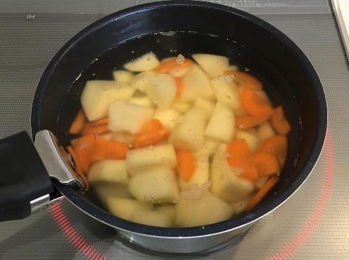 鍋に湯を沸かし、じゃがいもとにんじんを入れて約15分、柔らかくなるまでしっかり茹でる。茹であがったら、湯を捨てて鍋をもう一度火にかけ、15秒程加熱し、余分な水分をとばす。