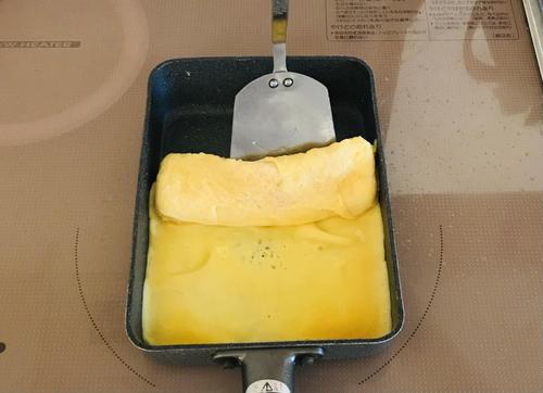 卵液の1/4を流し入れる。半熟になったら奥から手前に向かって巻き、また奥に移動させる。
