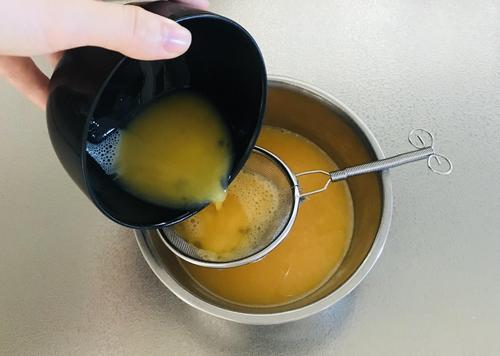 卵液を茶こしなどでこす。茶こしでこすことで、なめらかに仕上がる。