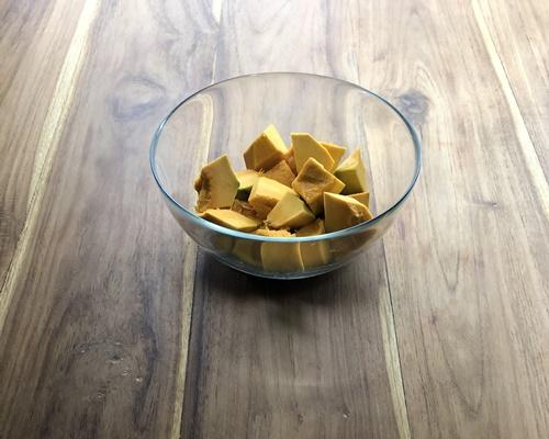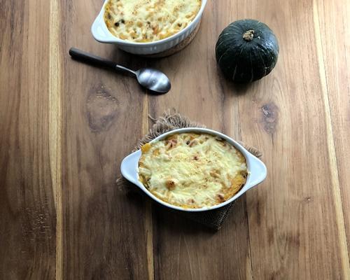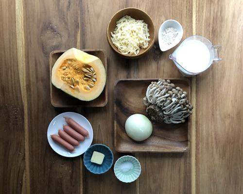 かぼちゃは種とワタを除き、皮を剥く。5cm角程度にカットし、レンジ対応耐熱容器に入れる。ふんわりとラップをして600Wの電子レンジで5分加熱する。皮はグラタンの具に入れるため、細かく刻んでおく。