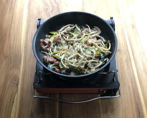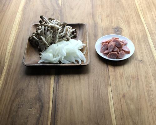 ソーセージは食べやすい大きさに切る。玉ねぎは端を落として薄くスライスする。しめじは石づきを取り除き、小房に分ける。