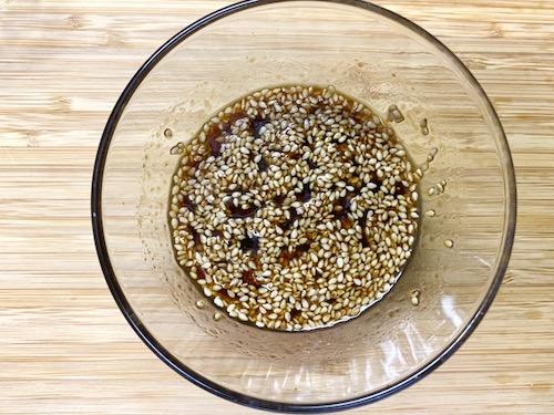 ボウルに醤油、コチュジャン、砂糖、ごま油、いりごま、おろしにんにくを入れてよく混ぜる。