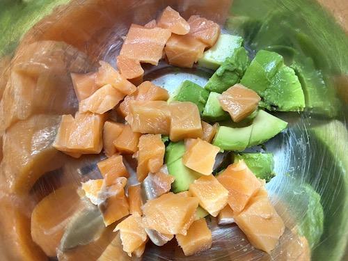 サーモンとアボカドは1cm角に切る。アボカドはレモン汁をかけて全体に絡める。