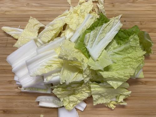 白菜はざく切りにする。葉と芯を分け、芯はそぎ切りにする。