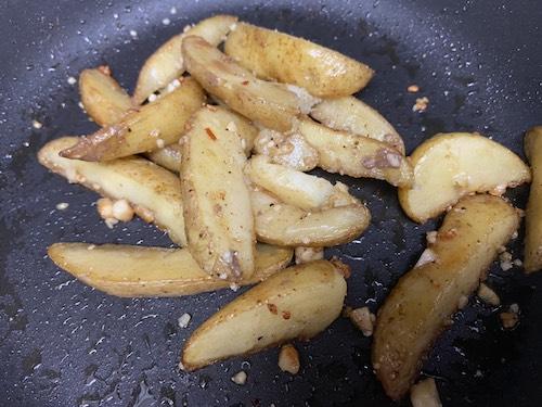 香りが立ってきたらフライドポテトを加え、中火で表面がカリッとするまで炒める。