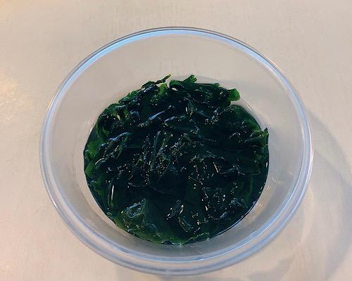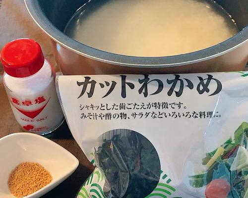 米は通常通りに研いでから、水を入れて炊飯する。わかめは水かぬるま湯に10分程度浸けて、戻しておく。
