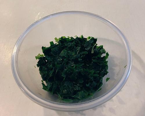 わかめを戻したら水分を絞り、キッチンバサミなどを使って、細かく切っていく。細かく切れば切るほど、ごはんとの馴染みがよくなるので、実践してもらいたい。