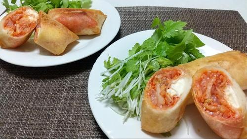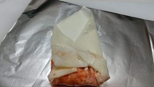 春巻きを広げ、中心よりやや下側に具材をおく。下側から包み、一回転させる。