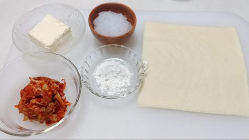 両端を畳んだら回転させて、巻き終わりに水溶き小麦粉の糊を塗る。キムチから水が出てくるので、なるべく手早く行う。