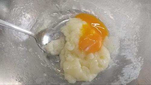 よく練った餅がなめらかになってきたら、バターを入れる。10回以上スプーンで混ぜて練っていく。その後、卵黄を入れて練る。もちもちして、均一に卵黄が混ざり込むまで練る。