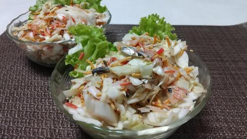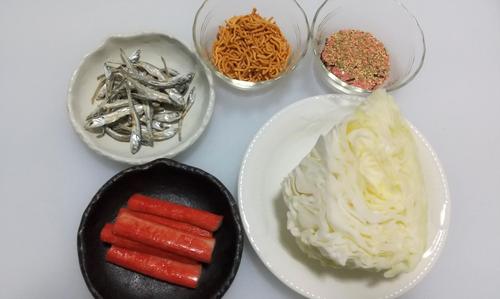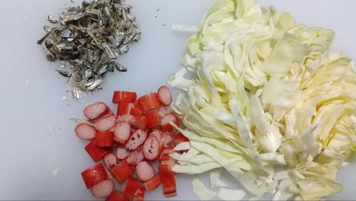 キャベツ、かにかまを1cm幅程度に切る。いりこを食べやすいように4等分くらいにする。どれも好みで大きいものが好きな方は大きく、細かい方が好きな方は細かく切ればいい。