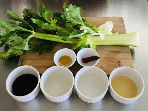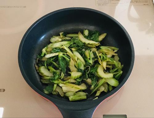 弱火にしたフライパンにごま油をひき、唐辛子を入れて香りを出す。香りがしたら、中火にしてセロリの茎を炒める。油が回ったら葉も入れ、しんなりとするまで炒める。