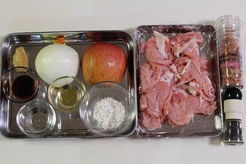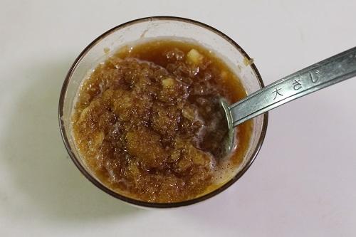 ボウルにすりおろしたりんご、生姜、酒、はちみつ、醤油を入れてよく混ぜ合わせる。
