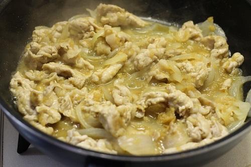 フライパンを熱し、サラダ油を入れて豚肉を強火で炒める。豚肉に火が通ったら、火力を少し弱め、中火にして玉ねぎを加え炒める。最後にSTEP2のタレを加えて、全体に絡めたら完成となる。