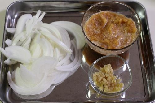 玉ねぎは皮をむいて端を除き、薄くスライスする。耐熱容器に入れて、600Wの電子レンジで約2分加熱する。あらかじめ、玉ねぎを電子レンジで加熱することによって、炒める時間を短縮できる。