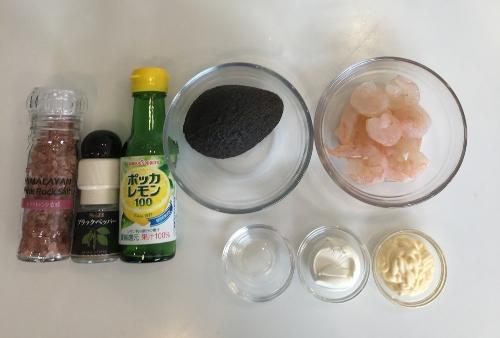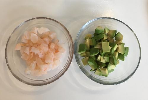 えびは1cm幅に切る。アボカドも半分に切り、種を取り除いて皮を剥いたら1cm角に切る。