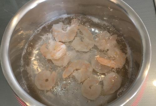 エビは背わたをとり、酒をもみ込み10分ほど置く。鍋に湯を沸かし、エビを茹でる。色が変わったら火からおろし、ザルにあげる。