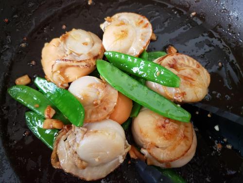 ホタテに色がついてきたら、さやえんどうを加える。軽く混ぜて味見をし、物足りないと感じたら塩(分量外)を入れて味を整える。さやえんどうに火が通り過ぎないよう、軽く炒めたらすぐに火を止める。皿に盛り付けたら完成だ。