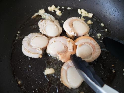 フライパンにオリーブオイルとにんにくを入れてから火をつけ、中火にして香りがたったら白ワインを入れる。そこにホタテを入れ、両面しっかり炒めていく。