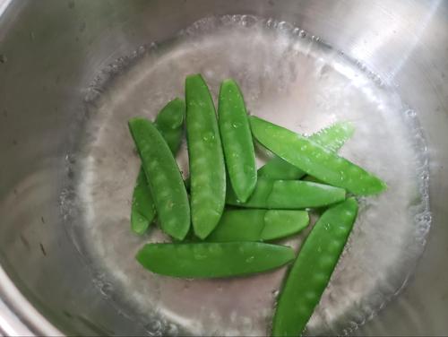 さやえんどうはヘタと筋をとり、お湯で1分程度軽く茹でておく。