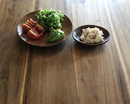 ささみは食べやすい大きさにほぐす。トマトはヘタを取り、等分にカットする。アボカドは皮と種を除き、スライスする。サニーレタスは細切りにする。