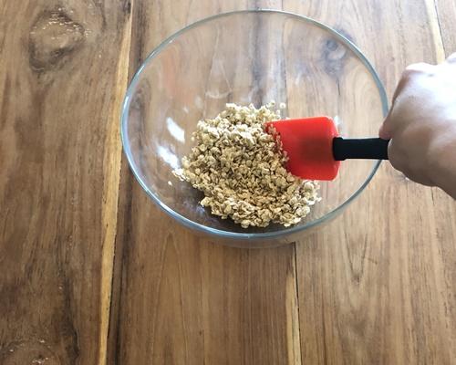 ココナッツオイルを600Wの電子レンジで1分加熱し、液体にする。ココナッツオイルをオートミールが入ったボウルに入れ、全体的に混ぜ合わせる。クッキングシートをしいた天板の上に広げて160℃のオーブンで20分程度焼く。または、フライパンに平らに広げて、混ぜながら加熱する。カリカリになったら取り出して粗熱をとる。