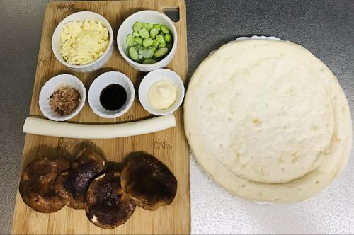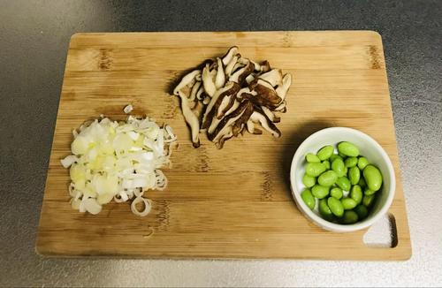 しいたけは石づきを取り、2、3mm幅程度の薄切りにする。白ネギは小口切りにする。えだまめは一度洗い、水分をふいておく。冷凍ピザクラストは常温に出しておく。
