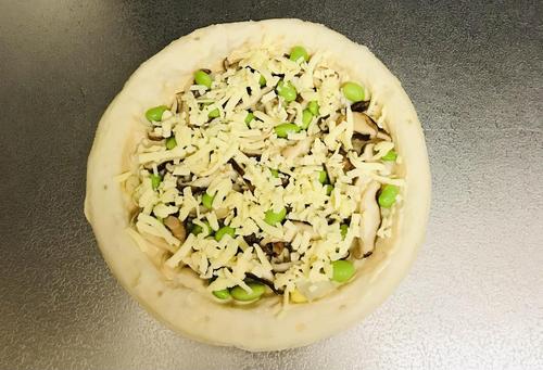 冷凍ピザクラストにソースを塗る。その上に白ネギ、しいたけ、えだまめの順番でのせる。