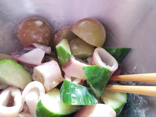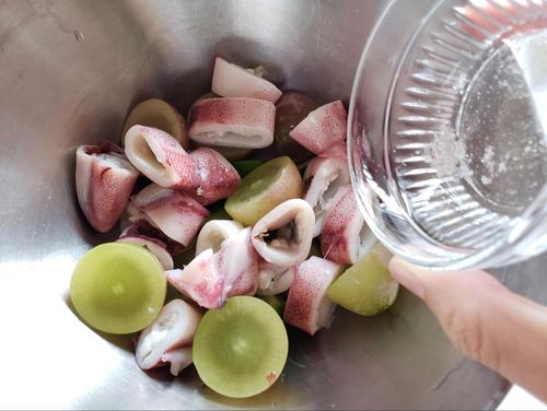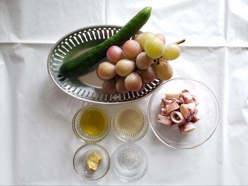 ぶどうはよく洗って半分に切り、和えたときに香りがでるようにする。種なしのぶどうを使うとキレイに仕上がる。イカは輪切り、きゅうりは端を落として乱切りにする。