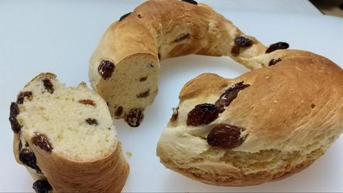 約1時間たったら、生地が1.5倍くらいに膨らんでいる。生地を取り出し、まな板の上で軽く広げる。それにレーズンを入れて軽く混ぜ、棒状にする。