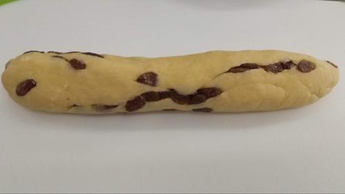 レーズンを加えて棒状に伸ばしたら、型に入れてオーブンで焼く。