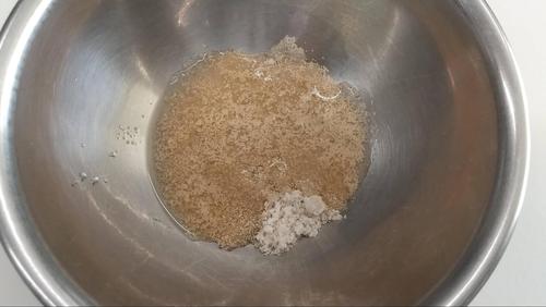 ドライイーストと砂糖を混ぜて、ぬるま湯20gで溶く。それにホットケーキミックス、卵黄、ぬるく温めた牛乳を入れる。