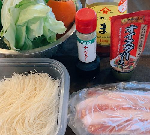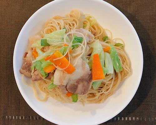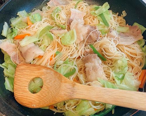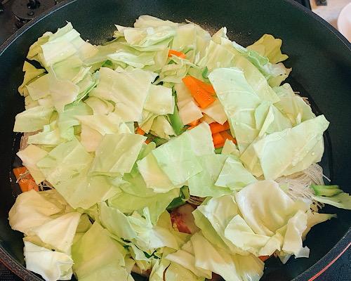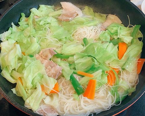フライパンにゴマ油をひいて、豚肉、ビーフン、野菜類の順番に重ねていく。水を1.5カップ入れて、ふたをして中火で2分程度蒸し焼きにする。