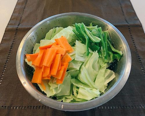 豚肉は食べやすい大きさに、キャベツはざく切り、にんじんは短冊切り、ピーマンは細切りにしておく。