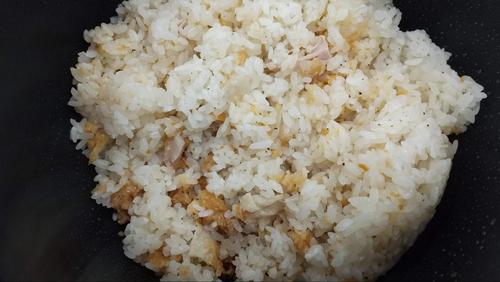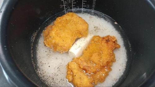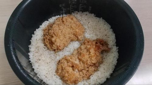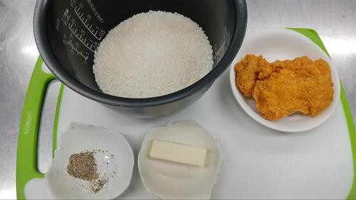 米を研ぎ、いつも通りの量の水を加えて炊飯器にセットする。フライドチキンとバター、胡椒を入れて、ごはんを炊く。