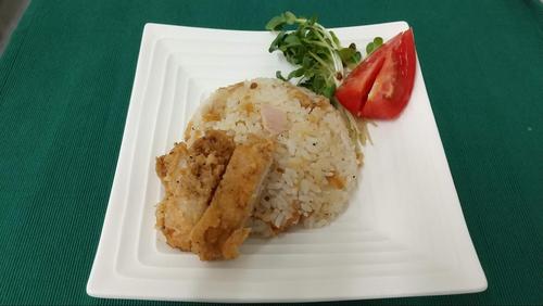 1枚はほぐしてごはんに混ぜ込む。残りの1枚は適当な大きさに切って飾り用とする。味を見て胡椒をかけ、ごはんとチキンを皿に盛る。