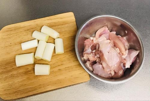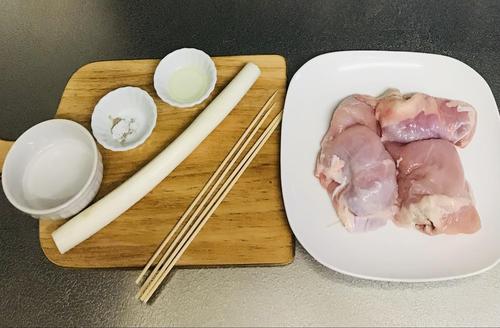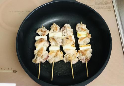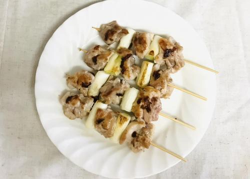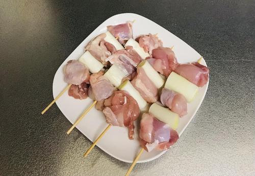 鶏肉、白ネギ、鶏肉、白ネギ、鶏肉の順番で串に刺す。