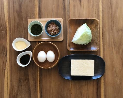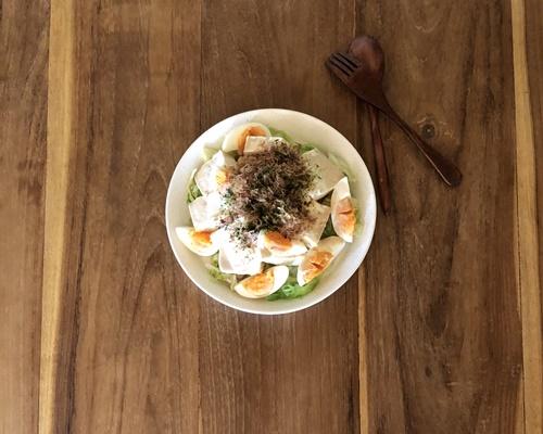 皿にキャベツ、豆腐、茹で卵を盛り付け、ソースをかける。青のり、かつおぶしをトッピングして完成だ。