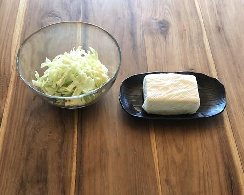 キャベツは洗って芯を除き、細切りにする。電子レンジ対応容器に入れ、ラップをして600Wの電子レンジで2分加熱する。流水で冷やし、しっかりと水気を絞る。豆腐はキッチンペーパーで包み、水気を切っておく。