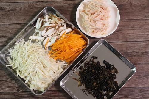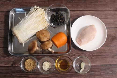 きくらげは水でさっと洗い、40℃程度のぬるま湯に15~20分程度浸けてもどす。付け根に硬い部分がある場合は取り除き、細切りにする。えのきは根元を切り落とし、長さを半分にして手でほぐす。しいたけは軸を取り除き、薄くスライスする。にんじんは皮をむき、細切りにする。サラダチキンは手でほぐす。