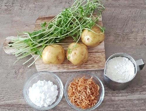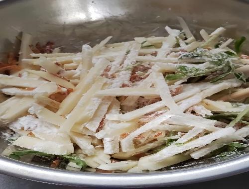 中サイズのボウルを2つ用意する。1つ目のボウルには、カットしたじゃがいも、豆苗、干しエビ、チーズを投入し、片栗粉を全体に絡めるようにまぶす。2つ目のボウルには、てんぷら粉と水を加え、箸でぐるぐると混ぜる。少し固めになるように水の量を調整する。