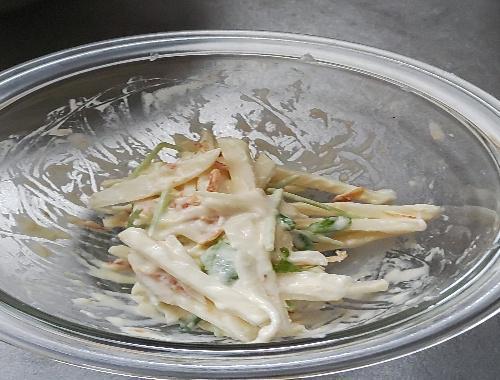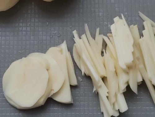じゃがいもはよく洗って皮をむき、5mm幅のスライスにした後、拍子切りにする。豆苗は3~5cmにざく切りにしておく。チーズは1cm角に切っておく。カレー塩のカレー粉と塩は、合わせて混ぜておく。